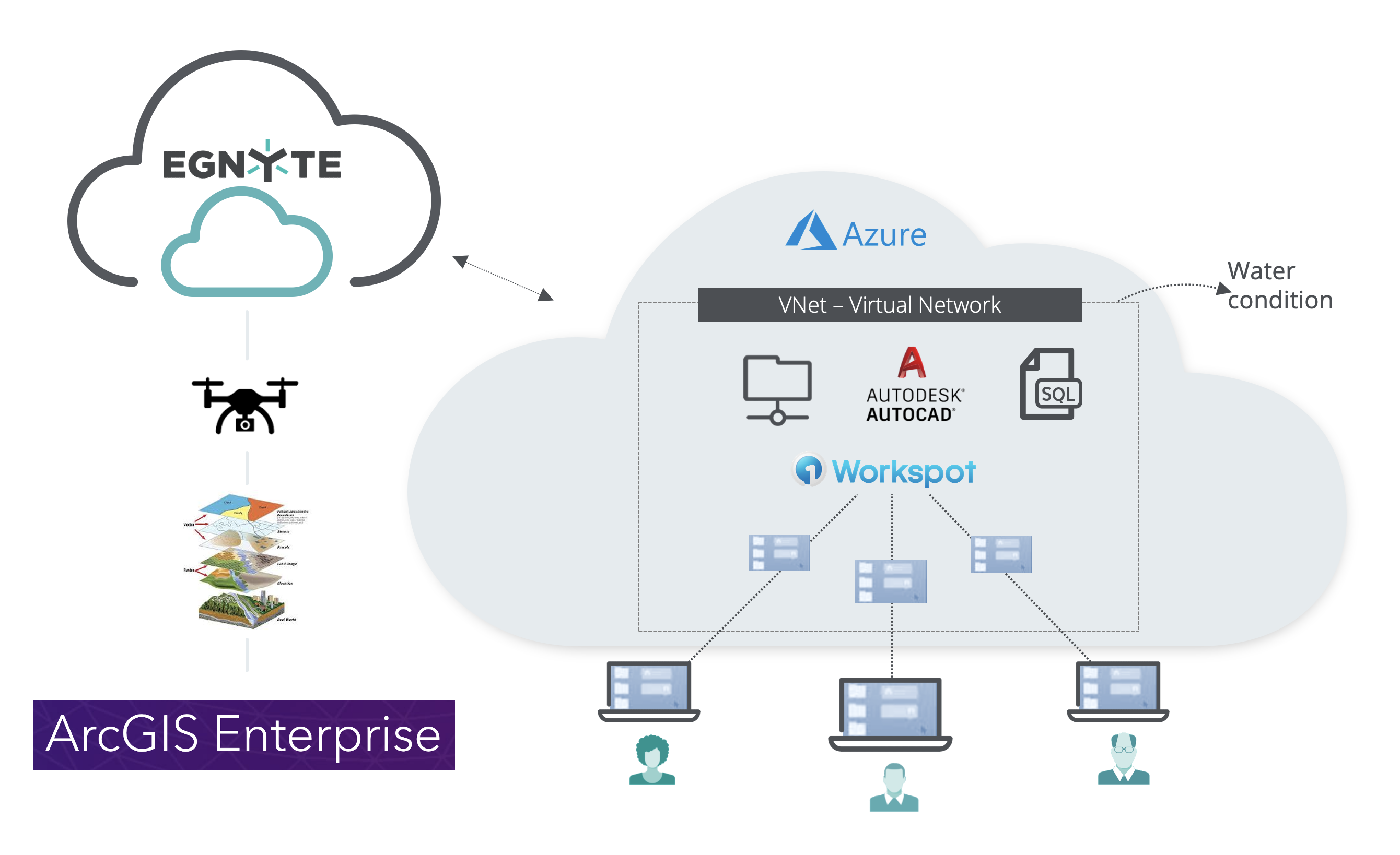 Remote offices, built with the right solutions, can help teams access their files and applications through a predefined environment such as Workspot running on Azure or AWS’ WorkSpaces. Workspot and WorkSpaces act as a virtual desktop, hosting key applications like Autodesk, providing access to each user, and allowing them to leverage the power and scalability of the public cloud when running large projects.