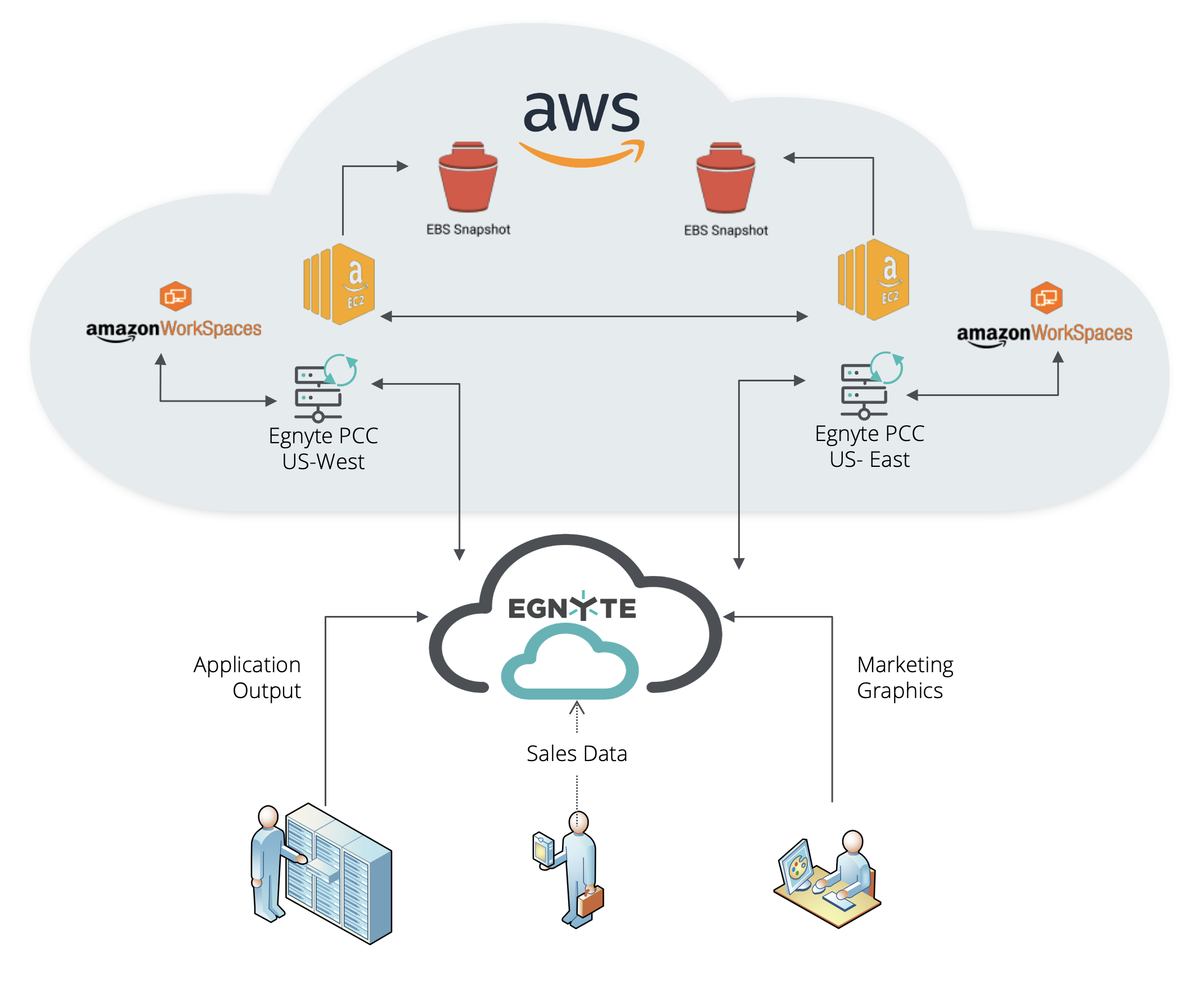 PCC allows companies to connect their Egnyte instance to the cloud hosting their virtual desktop. Egnyte then facilitates the syncing of content from external data sources, which are collected on local hybrid devices then passed to the Workspot or WorkSpaces environment. In this manner, Egnyte makes it easy for companies to manage their thin clients and reap all the benefits of data security and organizational permission structures, while enabling high compute consuming algorithms and team collaboration on a variety of applications.