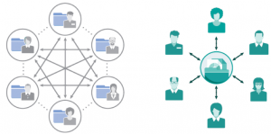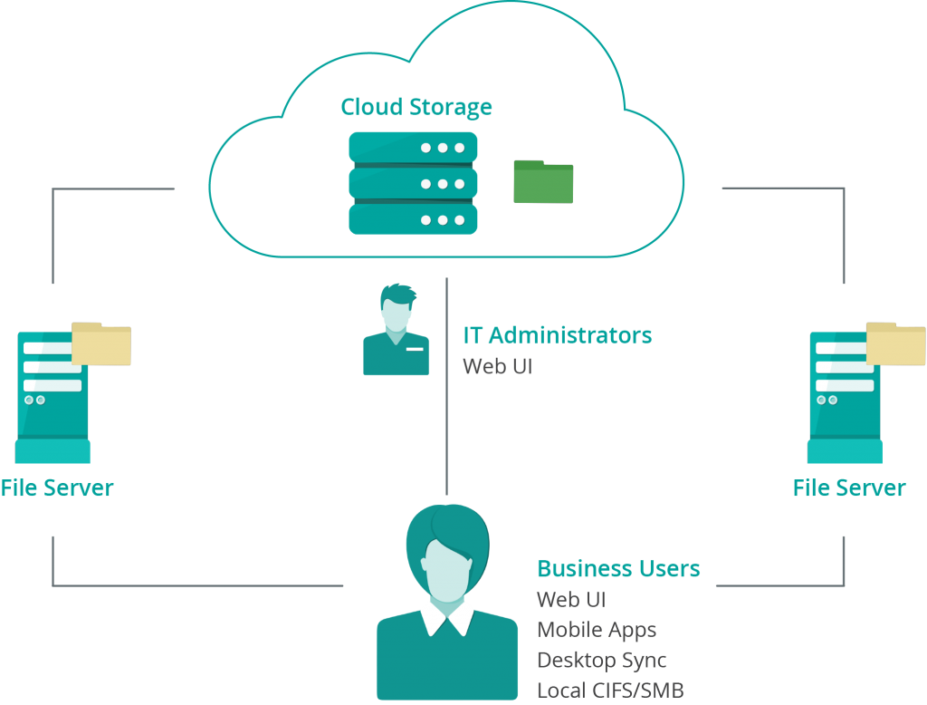 Figure 1. Consumer-first (L) and Business-first file sharing All business information resides in someone’s account rather than in a centralized, managed repository. Control over information, by design, lies more with the content creator than with administrators. Searching for a document or running an audit requires searching individually through each user account. As you’d expect, this architecture does not scale. One quick glance at Figure 1, right, will tell you why.Business-first file sharing solutions, on the other hand, are architected from the ground up for businesses. They possess a centralized content repository that is managed by administrators, eliminating content silos. They address numerous other limitations of Consumer-first solutions such as sub-folder level permissions, which we’ll discuss at length in future posts.Key Takeaway: If your small business has a handful of users and a single site, a Consumer-first solution may work out fine. Otherwise, opt for a Business-first file sharing solution. How can you tell? Look for the suffix ‘for Business’ or ‘Business’ in their names.2. Cloud, On-premises or Hybrid Storage - Do You have Options?Back in the day, files were stored and shared from file servers. Then came the cloud, and organizations began moving files to the cloud. But many organizations continue to use file servers, for reasons such as: