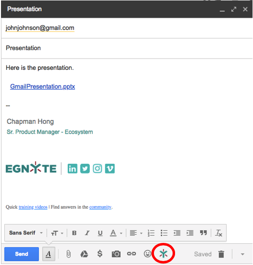 A few months ago, we quietly released the first part of our integration with Gmail. The integration enables users to save email attachments to Egnyte without leaving their inbox. It offers a simple way to keep attachments organized, accessible and easy to share with colleagues. But something was missing... If you were composing a new email and wanted to attach a file from Egnyte, you had to do it the old fashioned way; go to Egnyte, generate a link, and paste it into your email.
