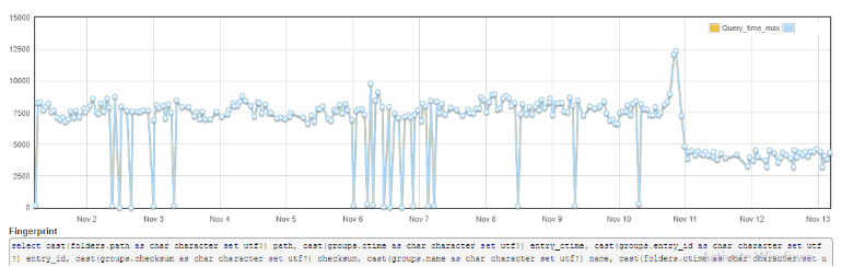 This change resulted in another positive outcome; all customer metadata was now collocated together in tables because customer_id was the first column on core tables. Also, full snapshot times for large workgroups was reduced to half, as shown by the dip in the graph below around Nov 11.