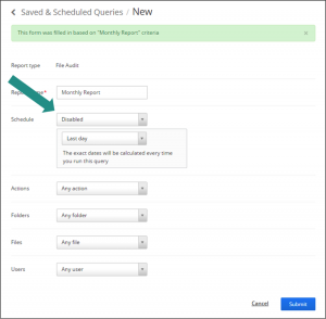 Set Up Recurring Audit ReportsDon’t waste the beautiful weather of Spring by sitting inside and recreating the same report. You can now set it up once and forget about it! Our automated audit report scheduler is now available just for that purpose.Scheduled reports allow IT admins to set various attributes for the scheduler, including frequency (daily, weekly or monthly), as well as time periods (last day, last 7 days, last 30 days or previous calendar month). This gives tremendous flexibility to IT admins to determine the audit report generation that best suites their corporate policies.Also, track your audit reports within the Saved & Scheduled Queries section, which will display details of all the recently generated reports, as well as upcoming scheduled reports.