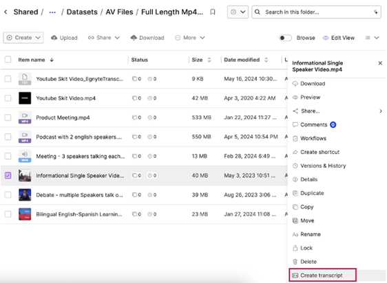 Egnyte’s AV search functionality addresses this by enabling users to search within AV files by matching search queries with transcripts generated for these files in the background. Users can create transcripts by simply clicking on the AV file and saving the transcript in their desired location for review and analysis, vastly improving the accessibility and navigability of AV content on Egnyte.
