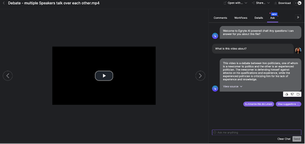 Egnyte users can take advantage of the AI functionality "Ask", which is seamlessly integrated into the file workflow. This allows users to easily pull out crucial insights such as file summaries or specific speaker notes when necessary, thus boosting productivity with ease.