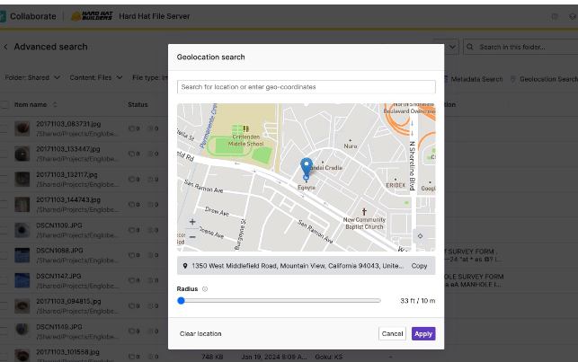 In the AEC industry, capturing on-site images is a daily routine, but finding them later can be very challenging. Geolocation search simplifies this process, enabling users to quickly retrieve relevant images by location.
