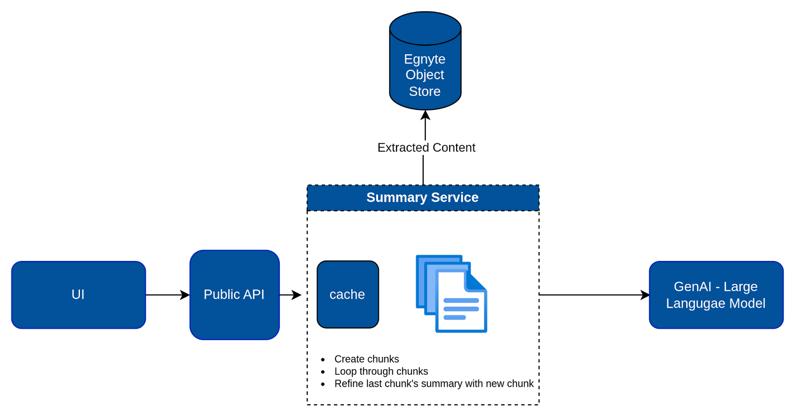 - When a user requests a document summary, the first step involves retrieving the extracted text from the file stored in the Egnyte Object Store (EOS).