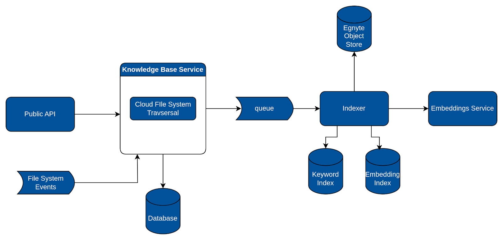 - The Knowledge Base service retrieves the extracted content from the Egnyte Object Store. It then chunks this content according to the offsets from the search API results and forwards it to our AI service.