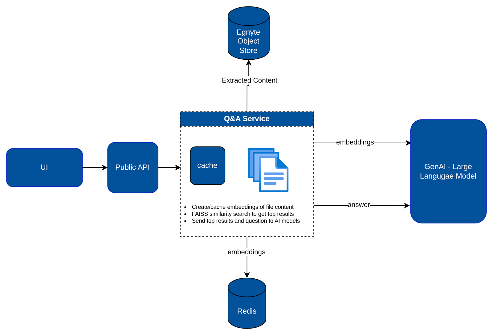 The next project problem we tackled led to the development of Document Q&A. Recognizing the need for a more targeted approach to information retrieval, we built a feature that allows users to ask specific questions about a file. This eliminates the need for users to sift through an entire document to find the information they need while still keeping the data safe and secure in their Egnyte repository. With this feature, they can simply ask a question about any file in Egnyte.