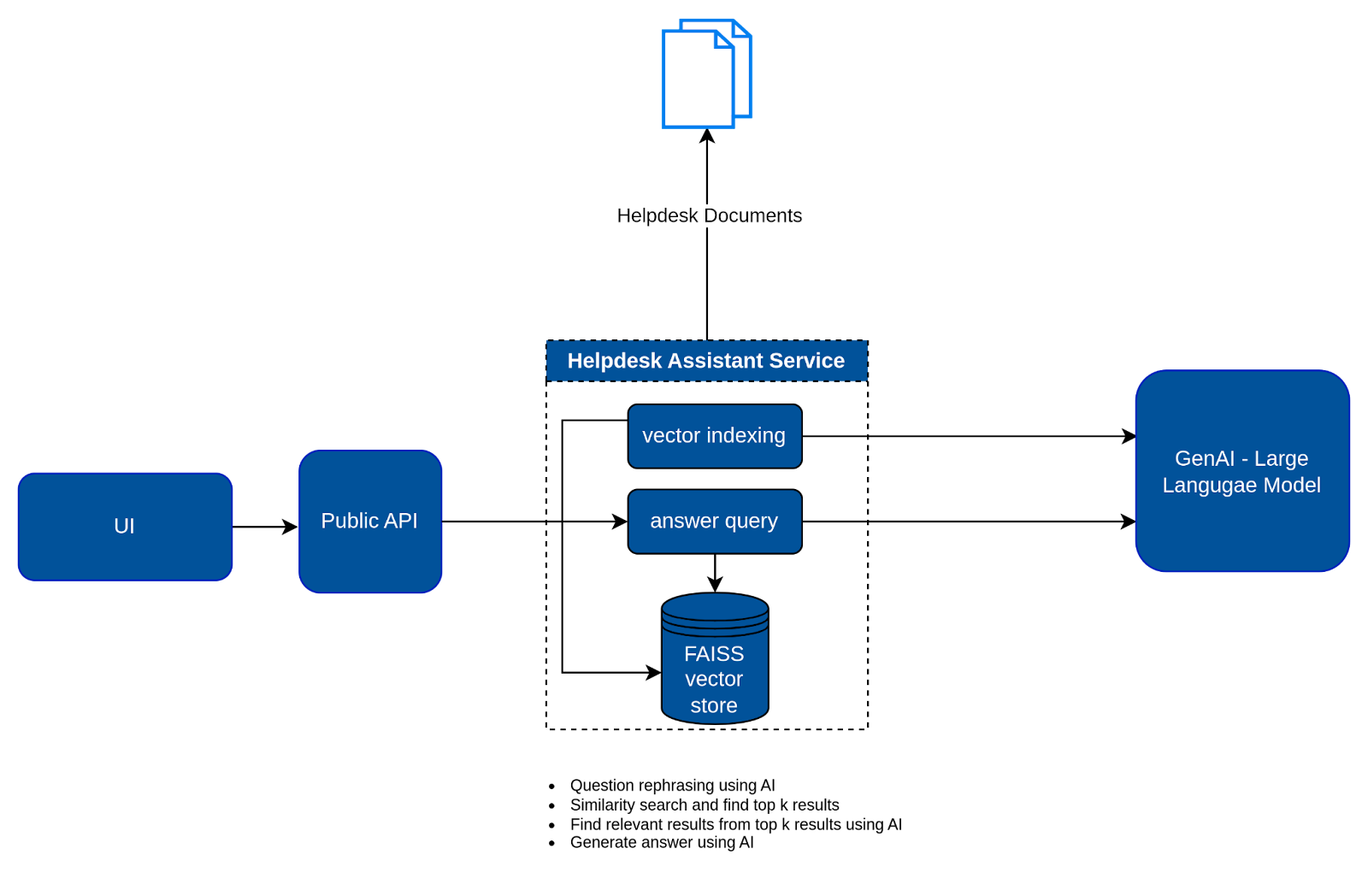 - The results from the similarity search are re-ranked using an AI model. The top-ranked chunks, along with the rephrased question, are then fed into the AI model to generate the response for the user. This response includes a citation from the relevant helpdesk article.