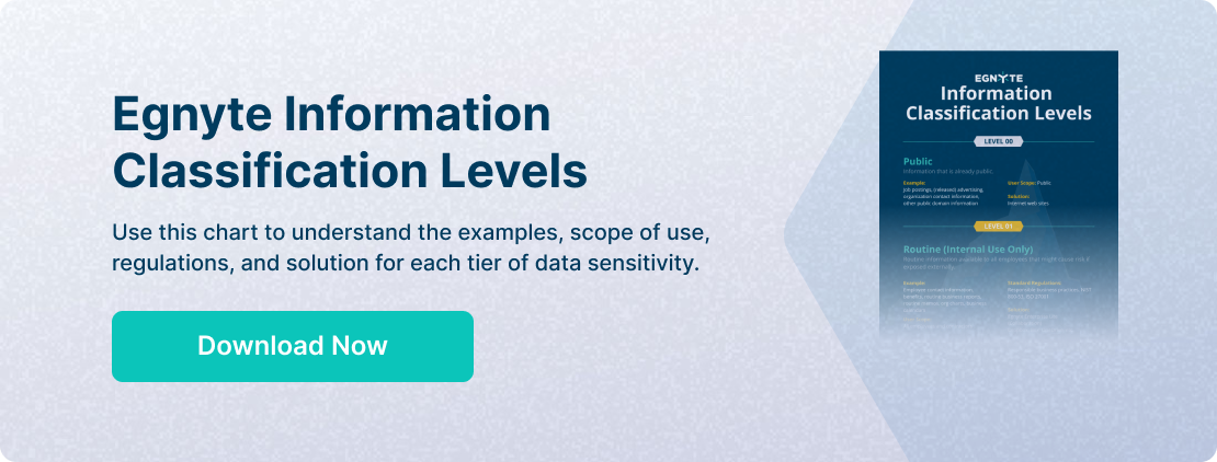 By developing a hierarchy of data sensitivity levels, you'll be better prepared to govern your data and find the Egnyte solution that fits your needs. For more information, click here to download an infographic you can use a reference point for your own analysis. For each classification level, you'll find corresponding examples, scope of use, regulations, and the Egnyte solution.