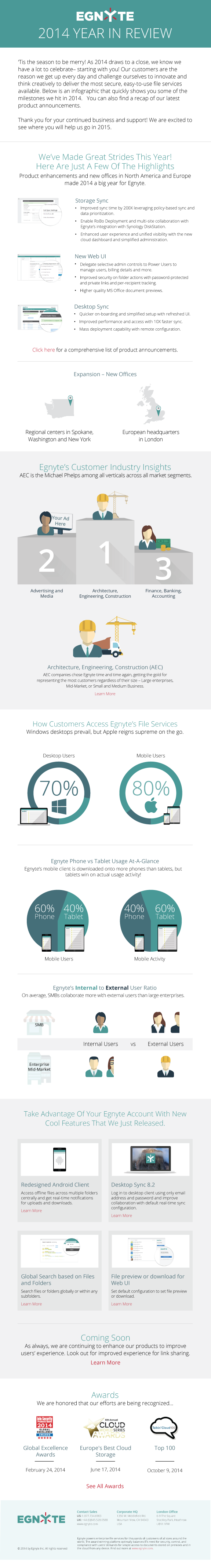 2014 was a great year at Egnyte! We’ve added new customers, partners, features, employees and offices in the U.S. and abroad. For the full recap of our year at Egnyte, check out the infographic below. Here’s to an even better 2015!