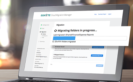 Cloud Migration Manager provides self-serviced, data-at-scale migration capabilities combined with usability features expected from an enterprise-grade product. Seamlessly migrate all of your files, folders, and folder permissions from an on-premises server to Egnyte Connect.