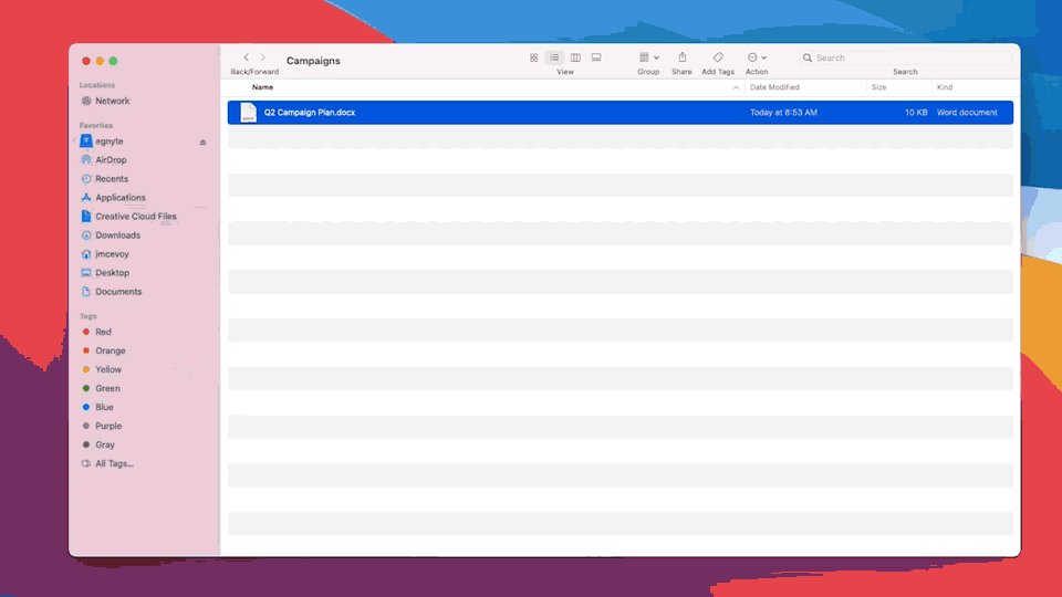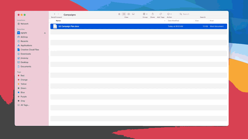 You can access the files you need through the Egnyte Desktop App or your web browser. To open a file from your desktop, go to your file manager—Finder for Mac or File Explorer for Windows—and right-click the file you want to work on.