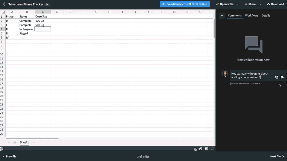 Once you’ve chosen to open the file, it will load in the corresponding application and you can begin editing as you normally would. You’ll see when other collaborators are in the same file, and you and your coworkers can make changes in real-time. You can also leave comments and tag specific individuals directly in the file.