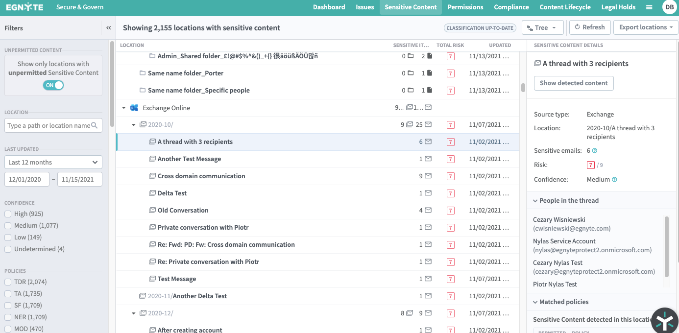 Egnyte will highlight sensitive content found in any mailbox in Exchange Online in the Sensitive Content tab of the Egnyte UI.