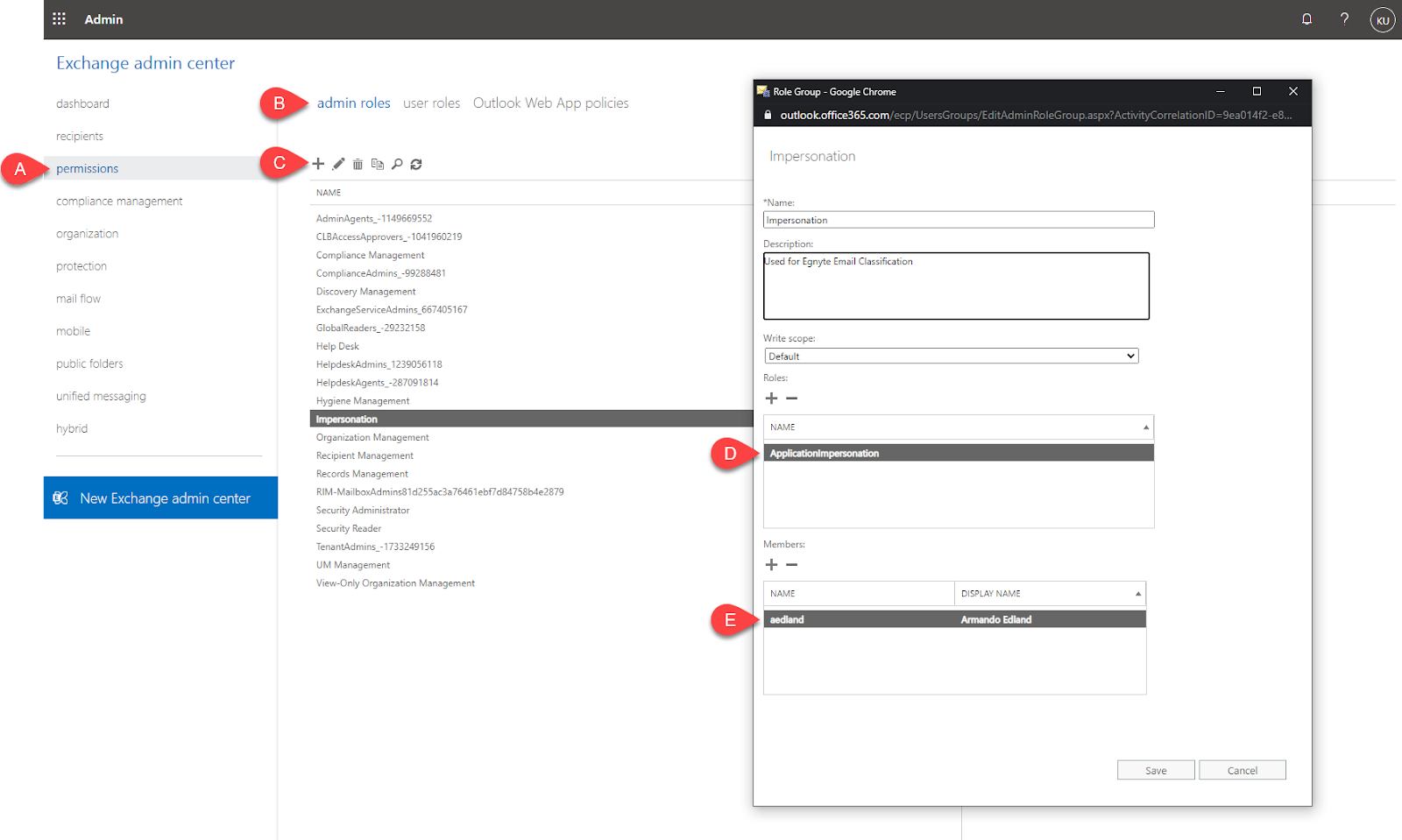 Once your policies are in place, go into the Exchange Online admin center. Add the Application Impersonation role to the appropriate admin user in order to give Egnyte access permission. This authorizes the system to access the Exchange Online server to begin content classification.