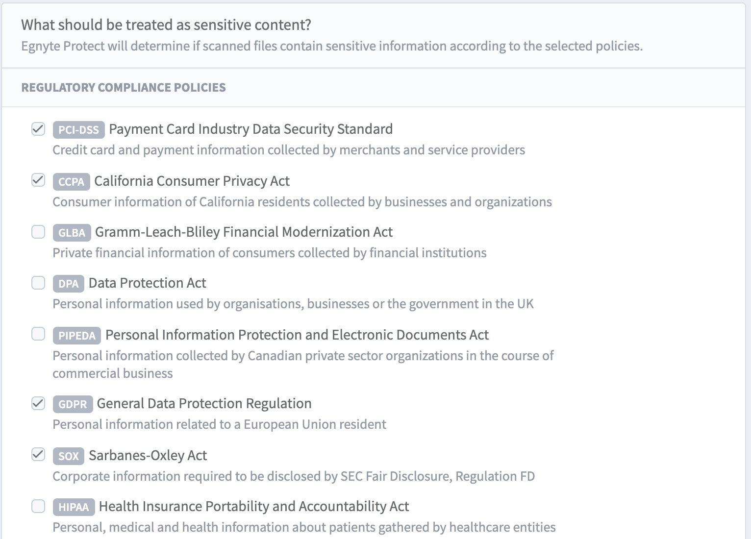 If you’re new to Egnyte, go to the Content Configurations tab in Settings and change the switch at the top to Identify sensitive content. From there, select your region and any applicable compliance policies.