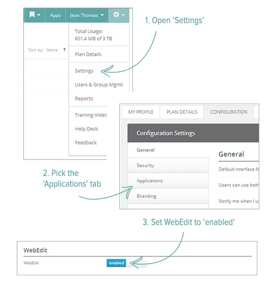 Today, we are introducing Egnyte WebEdit to enable you to open any file stored in Egnyte directly from a browser, edit in the appropriate application (word/excel/powerpoint/keynote/adobe cs6/autocad etc) and simply save it back. You do not have to go through a multi-step process of download, edit, save and upload anymore.The application is ideal for users who do not want to load Egnyte Map Drive or Personal Local Cloud (Desktop Sync) on their computer, and is more convenient than downloading, editing, saving and uploading the saved version back to the cloud.  Egnyte WebEdit is available to Administrators and Power Users.If you are interested in WebEdit, please contact us so we can enable this for your account. We welcome your feedback.**Update (February 2014): WebEdit is now available as a beta product to all of our customers, but an account administrator will need to enable it first. To enable WebEdit: open "Settings," pick the "Applications" tab, and set WebEdit to "enabled."  Below are a few screen shots for guidance:
