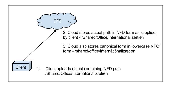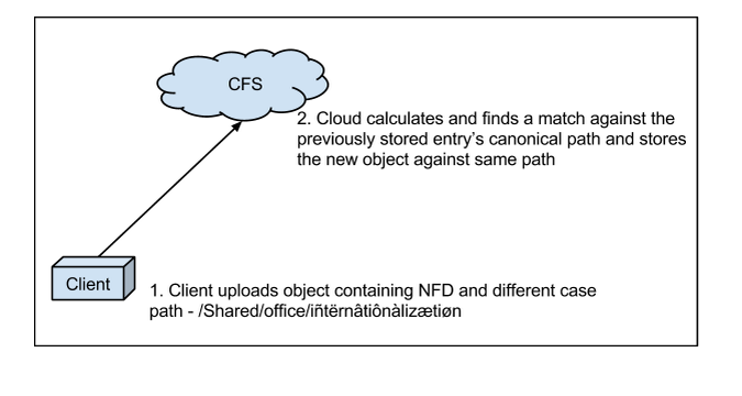 In addition to that, Egnyte also supports different unicode normalization forms for file paths.Synchronizing such diverse file systems involves reconciling a user’s view of the data set with that stored on the Egnyte Cloud File Server (CFS), which itself is a case insensitive and case preserving system.To achieve that objective, we had to first come up with a definition for canonical equivalence that would be adopted by Egnyte CFS and clients running in different environments. We decided to use a lowercase, NFC form of a path as the basis for canonical equivalence. NFC is the preferred version because of its compatibility with strings with legacy encodings. It is also slightly more compact, is generally fast to compute and has an additional advantage that most of the content online is already in this form. Using this canonical form, different Egnyte subsystems decide if two path entries have the same canonical representation and then determine how they should synchronize objects with these paths with each other.Lets take one of these subsystems, Egnyte CFS, to see how it brings synchronization on the cloud side to a steady state:1. It stores two versions of the file path for every file system entry created by clients: