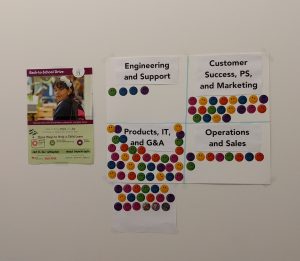 This event resonated with me personally because I owe everything to my education. I hoped my well-educated colleagues would be similarly committed, and I’m happy to say they proved that they are always willing to help.Once we signed up, we received tags that corresponded to grade ranges and had a list of supplies on the back. Participants picked a tag that they wanted and donated all the supplies on the back of the tag, as well as a backpack to hold all the supplies.The tags started to fly off the table once they were set out. Once Nicole or I received a backpack, we awarded a sticker on the board to the corresponding department. This continued until the due date of Wednesday, July 27. We also decided to host an informal competition, since Egnyters have proven competitive in the past. We grouped different departments so each group had roughly the same amount of people. As team members earned stickers and kept an eye on other groups, the drive really began to pick up speed!
