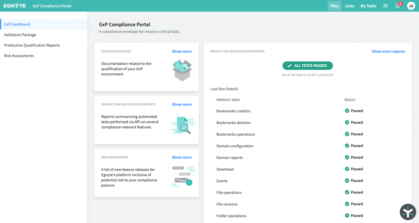 A major component of Egnyte for Life Science is support for GxP-compliance. Egnyte’s platform conforms to FDA 21 CFR Part 11 guidance and the EU’s Annex 11 directive that define how records and signatures are handled within electronic applications. The flexibility of Egnyte means you can comply with regulatory requirements, like audit trails, without distracting from your current workflows. Along with our audit trail functionally, you can create GxP-compliant documents through a review and approval process that amends electronic signatures to documents each time they are changed and approved.