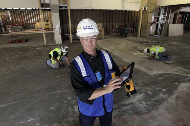 Jeff Pistor, head of technology for Balfour Beatty Construction's North Texas division, holds his iPad at D/FW International Airport in Terminal C. The company has gone paperless in its huge terminal remodeling project by using new technology and iPads and has saved $1.2 million.