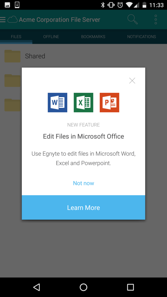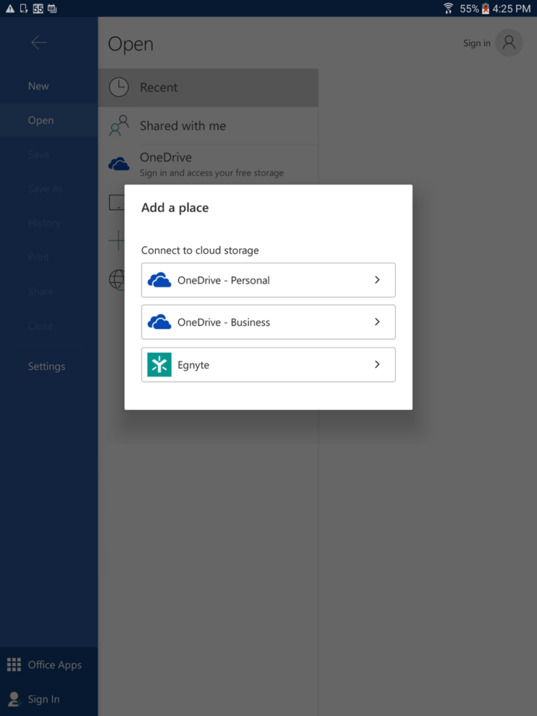 For Android users, this new integration makes Egnyte available as a repository in the Office mobile app. Once it's defined as a place, users will be able to open and edit Microsoft PowerPoint, Microsoft Word, and Microsoft Excel files saved in Egnyte, right from within the Office Android app.To add convenience, we have made this functionality available even without having the Egnyte app installed.