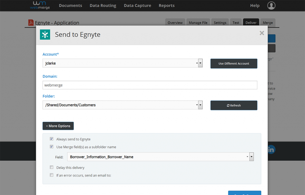 Any good sales person knows the importance of speed and responsiveness in closing a deal. As the digital workplace becomes increasingly efficient at every touchpoint, then, automation will become key to any sales person’s success. From communicating with leads to closing deals, your sales team can save countless hours per week. With a tool like WebMerge, your team can automatically populate documents like contracts, invoices, proposals and more. You’ll never have to copy & paste data into a template again.Once these documents are generated, they can automatically be saved in Egnyte Connect and easily shared with the rest of your team via link sharing. Gone are the days when documents are emailed back and forth or even lost somewhere in between. Pretty great, right?Integration in ActionWebMerge integrates with hundreds of cloud systems to automatically populate their data into your templates. Once your template is entered in WebMerge, you’ll setup the delivery to Egnyte so that each time a template is populated, the files are automatically saved to Egnyte Connect. You can even customize exactly where you want the files saved.