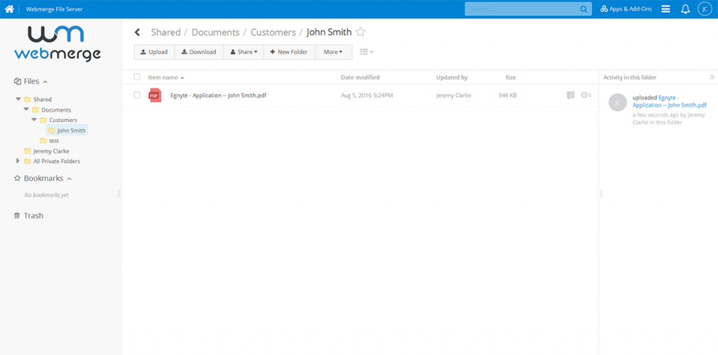 When your documents are generated in WebMerge, all you'll need to do is login to your Egnyte account and boom! There are your documents. It's that easy! Your whole team will have access to these documents and you can easily share with your customers.