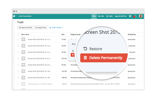Thwart accidental purges as the “Delete permanently” option in the dropdown will now turn red on hover. Upon click, a confirmation dialogue displays to ensure you understand which file or folder will be purged and this entails a permanent deletion.