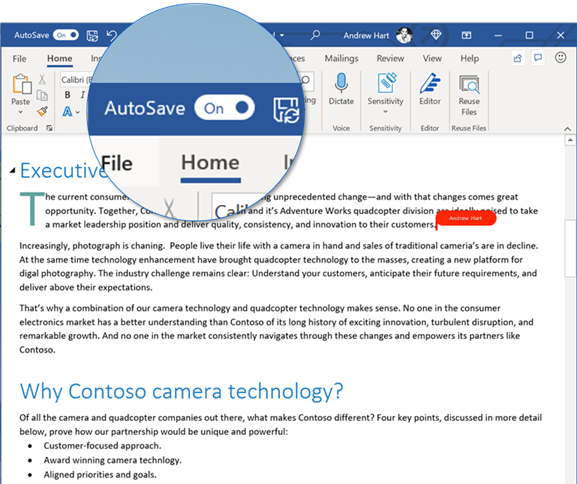 Egnyte has successfully integrated with the Microsoft Productivity Suite. This ensures that users can simultaneously edit and collaborate on Microsoft Excel, Word, and PowerPoint files in real time, with all changes automatically saved to the Egnyte account. This works with both M365 Online as well as desktop tools, and works with files stored in Egnyte or Microsoft. In true co-editing mode, each user sees the cursors for the other users as well as changes on the screen. If required, a user can globally lock a shared file to make changes without interference from others. When enabled on a user’s desktop Microsoft application, the “Autosave” button at the top of each editing screen defaults to the Egnyte environment with no changes required from the user.  Also, the Egnyte desktop app provides a mapped drive letter experience to the Windows user, making the files appear local to the user and to local applications.