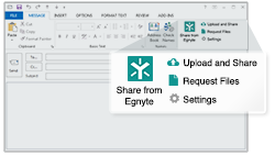 2. When I select the option, ‘Share from Egnyte' in Outlook, when does it expire, who can access, etc?The default link settings are set by your admin. These will determine your security settings. You can always change them by clicking on 'Settings' right under the 'Share from Egnyte' button. 3. What is the benefit of sharing a file through an Egnyte link vs sending an attachment in Outlook?There are many benefits from sharing an Egnyte link vs sending an attachment from Outlook. First, email attachments have file size limitations which will prevent you from sending larger files. ( Most environments have a 20MB file limitation). When you generate an Egnyte shared link, you have the option to add password protection for further security. You also have the option to set a link expiration based on time or number of clicks or delete the link if you need to revoke access.Potentially more important is the fact that you can track whether the recipient has accessed the link, and how often they look at it. Lastly, if your team is making changes to the file, you would have to send every new version as an attachment over email. With an Egnyte link, the latest version is automatically available to the recipient.4. What version of Microsoft Office does Egnyte support for Office Desktop?Office 2010 is the oldest version we support for the Desktop Plug-in, but we recommend 2013 or 2016 for the best performance. For Office Online, an Office 365 for Business subscription is required. Egnyte Office Mobile capabilities are supported on the latest version of the Office Mobile apps.