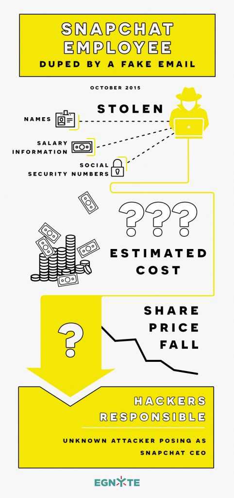 Sometimes it seems even employees with the best intentions can inadvertently cause a serious data breach. Snapchat learned this lesson the hard way in February 2016, when a hacker posing as its CEO, Evan Spiegel, emailed an employee from a fake account requesting the names, social security numbers, and salary data of around 700 current and former employees.This case highlights the need for companies to provide sufficient employee training to enable them to spot the warning signs. Snapchat released a blog post apologizing for the incident, and had to provide those affected with two years of identity theft protection and work closely with the FBI to find the perpetrator behind the scam.With the world still reeling from the WannaCry attack, it appears neither big businesses or non-profit organizations are safe. Worse still, few companies appear to be learning lessons from past cases.It seems prevention is better than cure here: it’s worth investing in and reviewing a robust data security strategy. And, should the worst happen, an open and honest policy on owning up to it goes a long way in terms of protecting a brand’s image.Using a sturdy cloud solution like Egnyte can make it less likely careless employees could expose sensitive documents and information, while also making it harder for external threats to gain access to your internal file sharing.Sources: