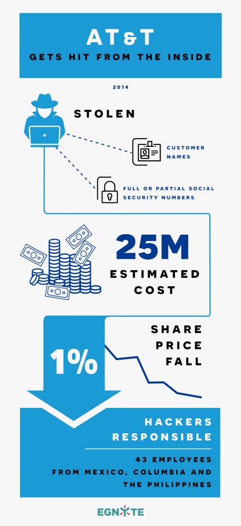 Another month goes by and another big brand is left red-faced at the center of a major hacking scandal. In the last two years, LinkedIn, Tumblr and Adult Friend Finder¹ have all been hit hard by major hacks, and the May 2017 WannaCry ransomware attack has proved that even hospitals and other public services are not safe.²The full details of the attack are yet to surface, but an estimated 200,000 computers spread across 150 countries were hit, with FedEx, Nissan, and the UK’s National Health Service (NHS) among the victims. Reports suggest it’s one of the biggest global ransomware attacks ever, and appears to have stemmed from those attacked running older, unsupported Windows operating systems.As well as being a huge embarrassment for the organizations involved, the direct and indirect financial cost of such an attack can be gigantic. Over in Europe, the 2016 announcement of the EU General Data Protection Regulation (GDPR) means business owners who don’t protect their customers’ data adequately can face eye-watering fines.But, keeping your business safely secured from the outside world alone isn’t always enough. Insider data breaches can equal big dollars or disruption for rogue employees keen to make a fast buck or settle a personal score. While more innocent employees may require training to prevent falling foul to a phishing scam from an external source that could lead to a breach.So, what is the true cost of a data security breach, and what can brands learn from cases gone by? If history tells us one thing, it’s that no brand is too big to take an almighty fall.AT&T gets hit from the inside3• Stolen: 280,000 US customer names, and full or partial social security numbers• Estimated cost: $25m• Share price: Fell by 1%• Hackers responsible: 43 employees from Mexico, Colombia, and the Philippines