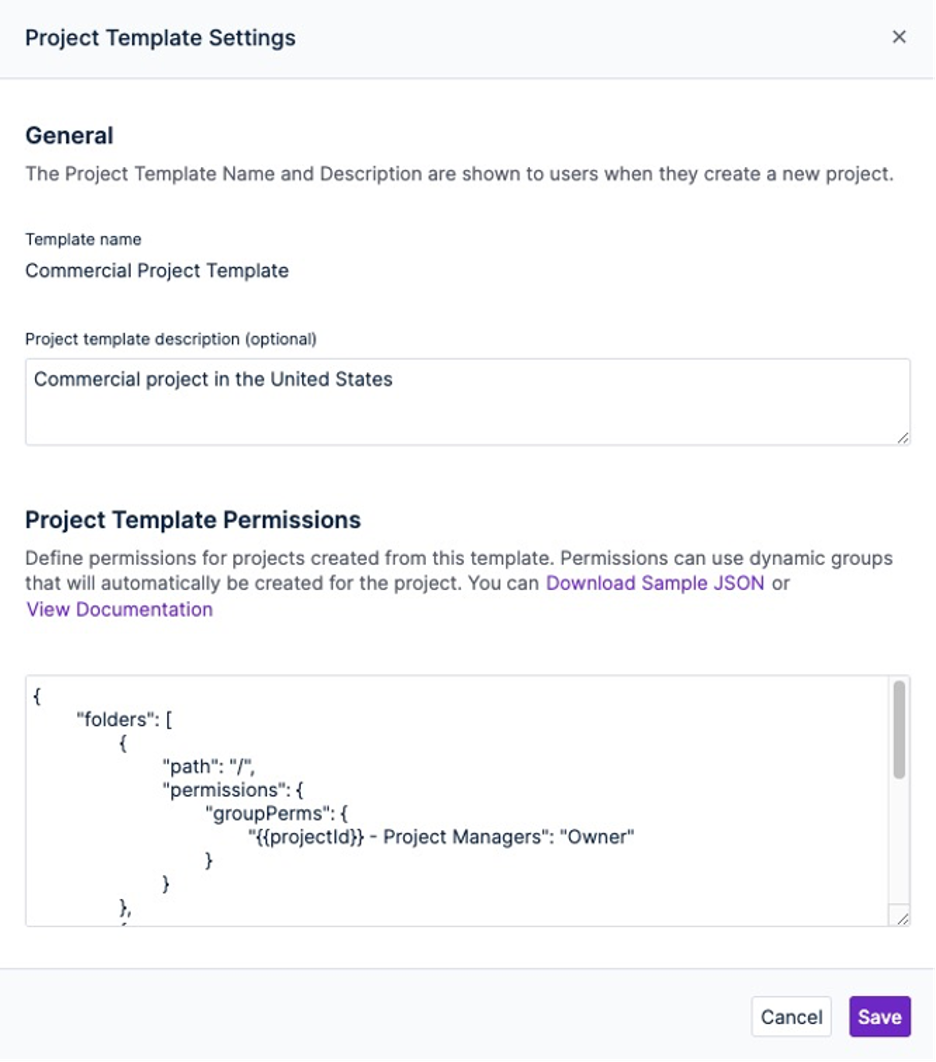 To create a new project template, create a folder structure under /Shared/EgnyteTemplates/Project Templates. Give the top-level folder a relevant name, e.g., "Commercial Project Template." Use Project Template Settings from the More menu to set a template description and configure the templates' groups and permissions (If the template you want to use already exists, you can skip down to step 2).