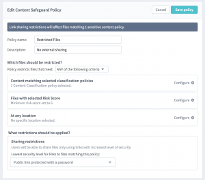 To help you execute on next best actions, we are integrating the Risk Score into Egnyte’s Content Safeguards, which protect your repository from data leaks by restricting public links to sensitive files. You can create Content Safeguard policies that limit links to a minimum security level based on sensitive content matching, risk score, and location, which are then automatically enforced.