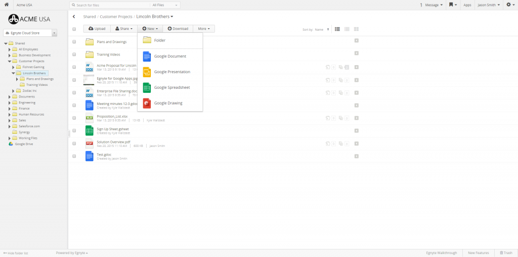 Additionally, Egnyte for Google Apps allows admins to move away from a user-controlled sharing environment, where it’s up to each user to responsibly share and organize content in each of their Google Drive accounts. Instead, Egnyte offers an admin-controlled environment, where all users operate from a single centralized file repository with different levels of access, increased productivity and enhanced security.Time is saved because content is easy to find and reference when it’s all in one place. When someone finds useful content that is created by another business unit, time is also saved by preventing unnecessary re-work. When employees make reference to the Marketing folder, for example, other employees know exactly what they’re talking about because they’re looking at the same folder structure.Data is also secured because admins control what level of permissions users have to the central content repository. Users no longer need to be concerned about sharing content with the right people and can focus on creating content to drive the business forward. Even Google documents like docs, sheets and slides are automatically shared with the right people based on Egnyte’s folder permissions.