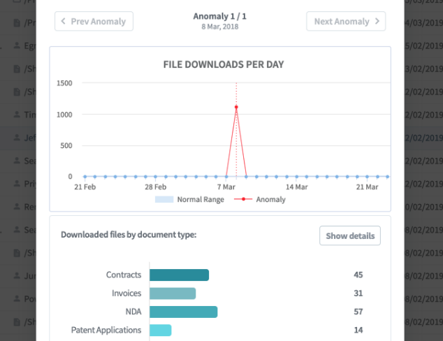 With this capability, Egnyte Protect’s anomaly models can also incorporate the business document types being accessed in file download events. We can not only inform administrators when an abnormally high number of files has been downloaded, but we can also provide information about the types of downloaded files: how many contracts, how many NDAs, how many employee lists, etc.