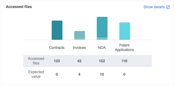Based on the classifiers built with Google AutoML Natural Language, we can build a personalized profile of the type of files a given user usually accesses. For instance, John might access about 4 invoices per week, 10 NDA and no patent applications.