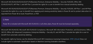 Microsoft Information Protection Licensing Breakdown: Automatic Sensitivity Labeling vs. Manual The sheer breadth of Microsoft’s available governance, security, and compliance modules and licensing options can make it difficult to track and understand exactly which functionality is available under a given license. Microsoft customers must carefully evaluate which features are most important for their specific compliance needs, and whether their plan supports it. With more than 60 features and functions across 20+ licensing tiers, this can be daunting, but it’s worth reading the fine print. For example, as of October 2020, an M365 E3 license includes access to the new Compliance Manager dashboard, but a quick look under the hood reveals that most of the strongest functionality is not usable without an upgrade to the E5 license. Those include automated classification and keyword-specific retention policies -- both extremely valuable for compliance with GDPR, CCPA, and financial regulations. For important features like sensitive data labeling, interrogating the license terms can help determine what exactly is included, and whether it covers the apps that users really need (e.g. PowerBI).
