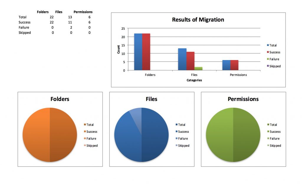 But here’s the kicker, not only does the Cloud Migration Manager migrate files and folders but it also migrates folder permissions. No other self-service data migration solution available today supports file and folder migration along with permissions migration, a key need for any serious business.The Cloud Migration Manager continuously monitors and records activity during the migration process so you always know the status of your data. The results are summarized and displayed in an easy to read dashboard, and you can drill down for more details by downloading a comprehensive report.