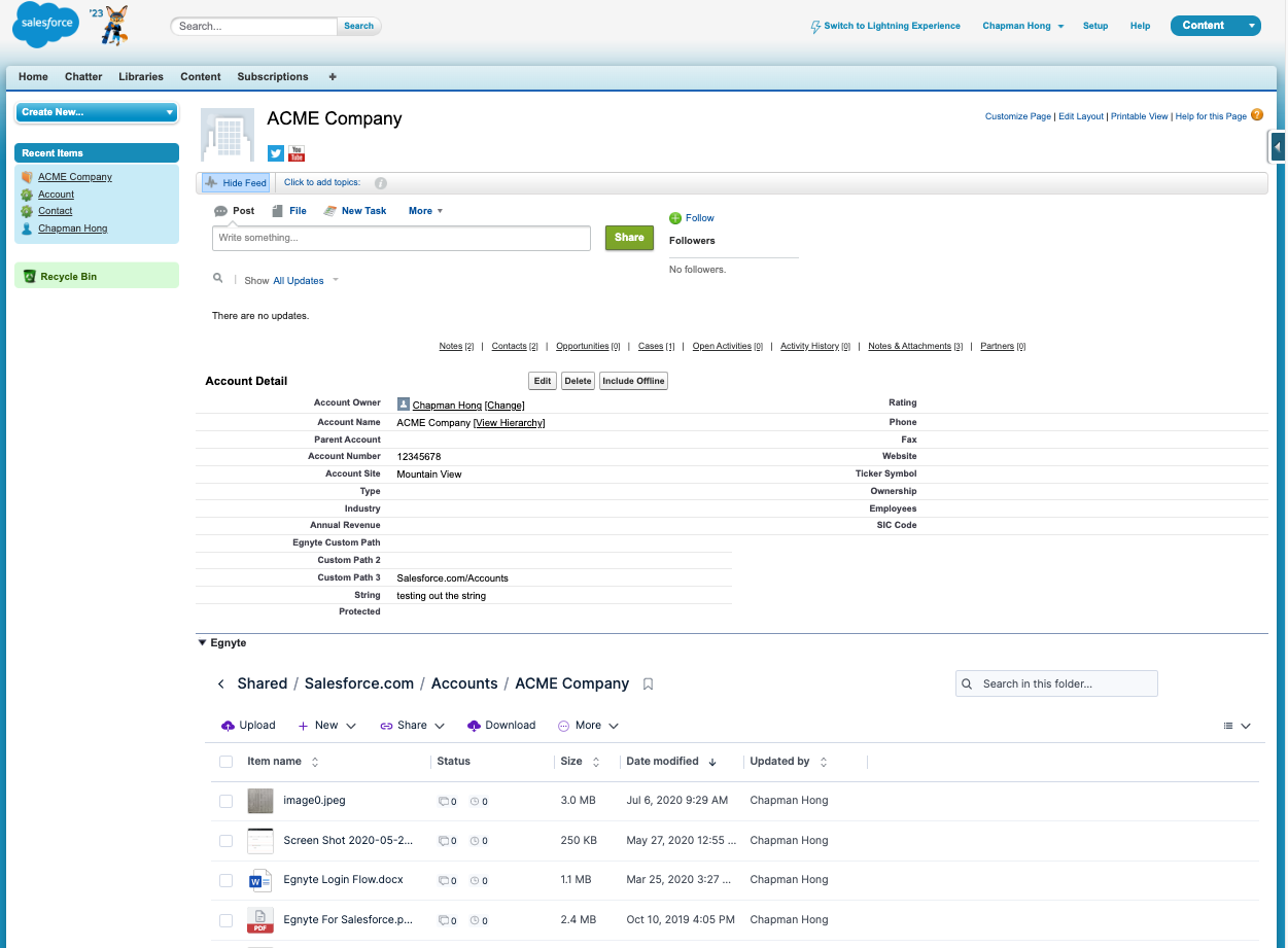 Once the integration has been completed between your Salesforce account and your Egnyte account, your sales team will be able to access files from within Salesforce without leaving the application. At the bottom of a typical customer screen, an Egnyte window appears in the Salesforce interface as shown in the image below.