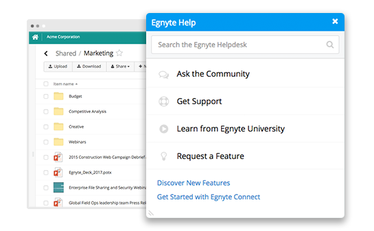 New Help Widget January 9, 2018 The new help widget makes it easier to access the new Egnyte Community, Helpdesk, and Egnyte University. Share this Blog AUTHOR Cassie Torda View All Posts PRODUCT ARTICLES Bridge the Gap: Federated Project Collaboration for AEC Teams With EgnyteJune 25, 2025Joëlle ColosiProduct Marketing ManagerRead Article Unify Your Data Defense With Egnyte, Microsoft Purview, and NetskopeJune 12, 2025Vinaya SathyanarayanaPrincipal Product ManagerRead Article May Release Rollup: AI Search, E-Signature, and More June 2, 2025Sanjay KosuriProduct Marketing ManagerRead Article