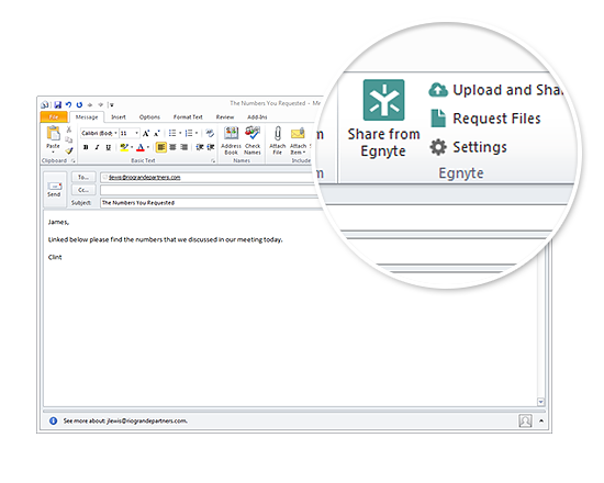How does it work? If an email has attachments, users can click the Save to Egnyte button and specify a folder in Egnyte for uploading the attachments. OR, a user can set a default upload location for saving attachments, allowing the files to automatically save to the default Egnyte folder in a single click!Create Upload Links