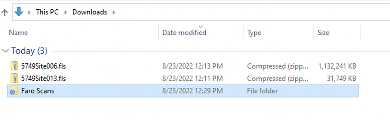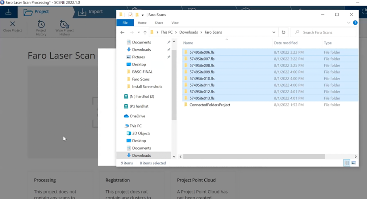 Next, drag and drop the point cloud content from the external hard drive or SSD to the Connected Folder. In this example, I dragged and dropped my point scans into the Faro Scans folder on my laptop. Since the drag-and-drop operation is to your local disk, the point clouds get transferred at local disk speeds, taking minutes vs. hours.