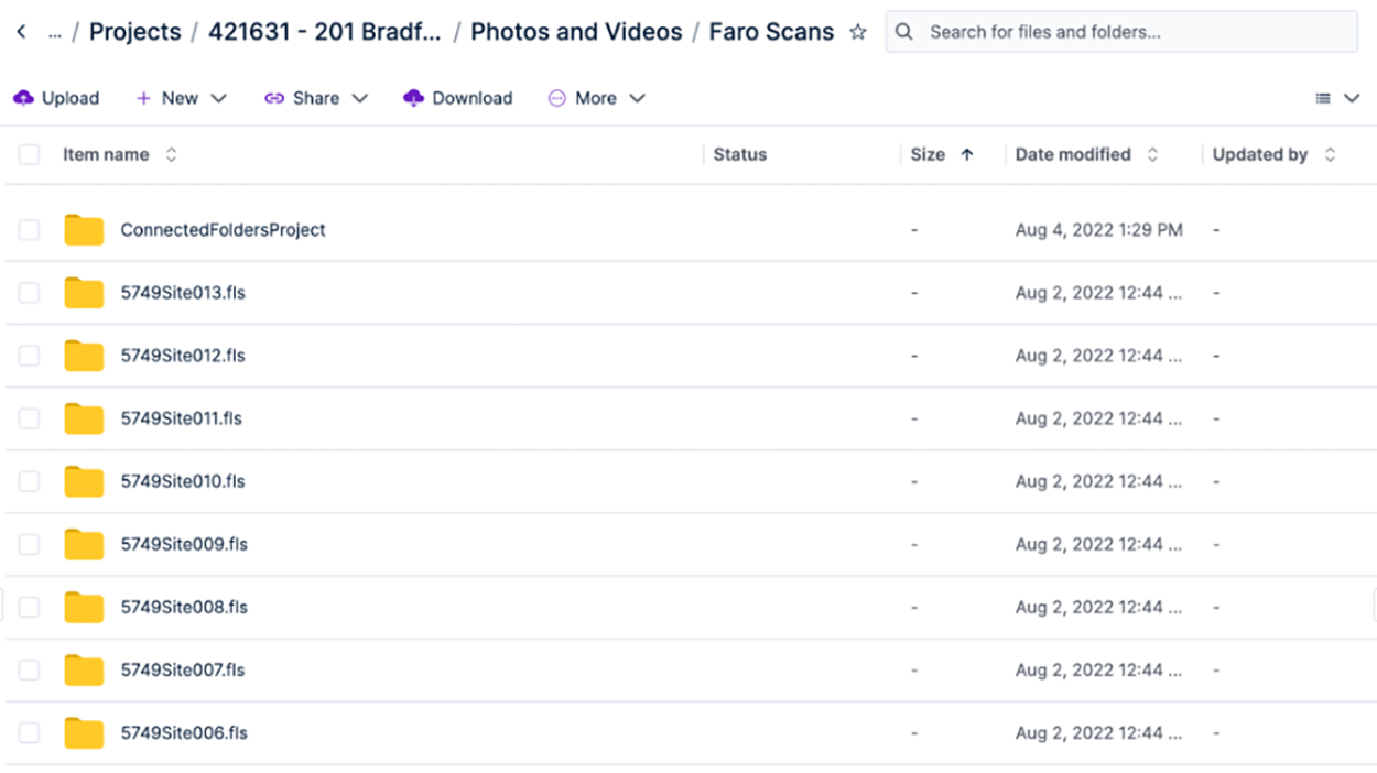 “Faro Scans' folder connects with /Shared/Projects/421631-201Bradford/Photos and Videos on Egnyte cloud.