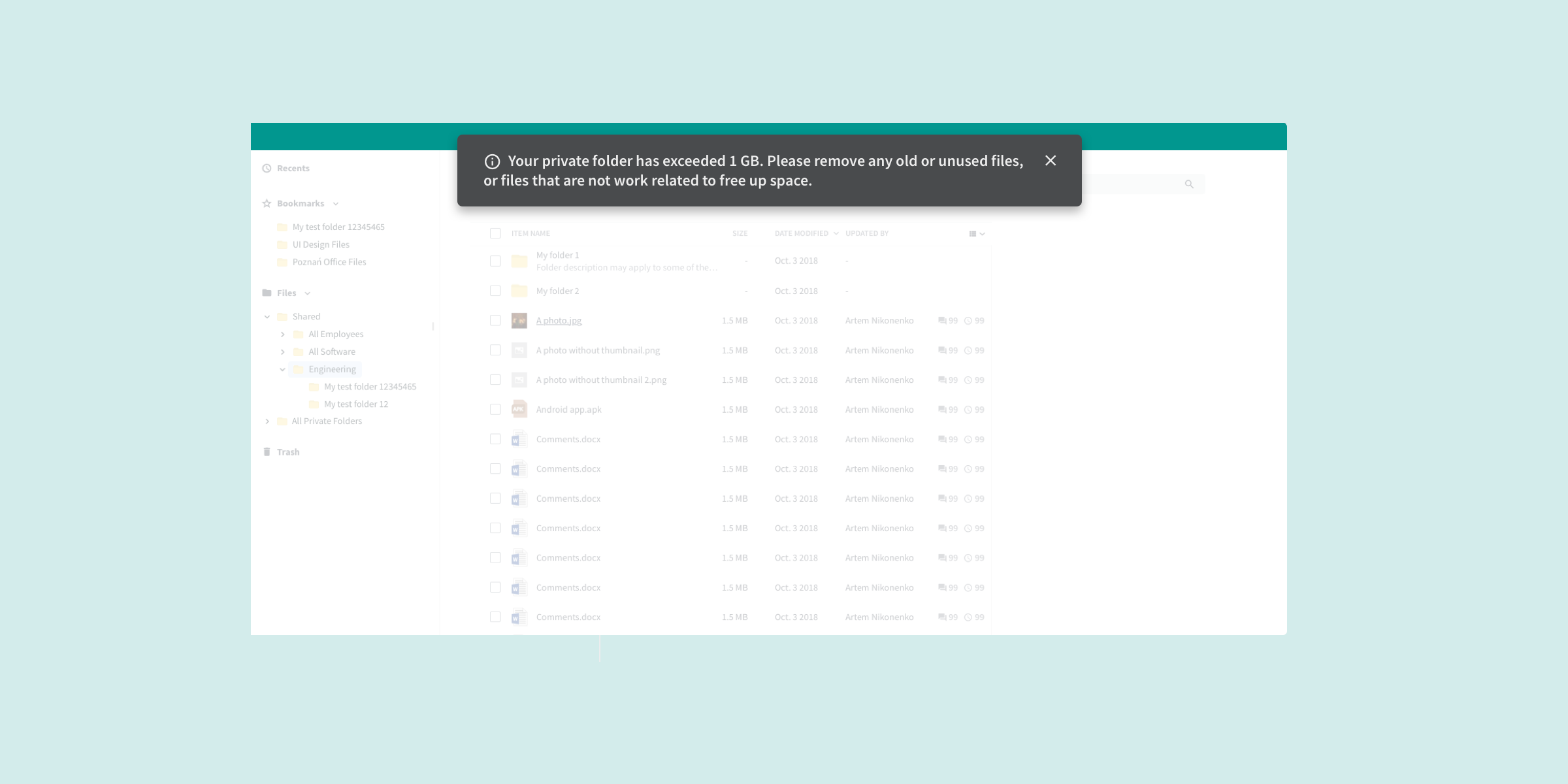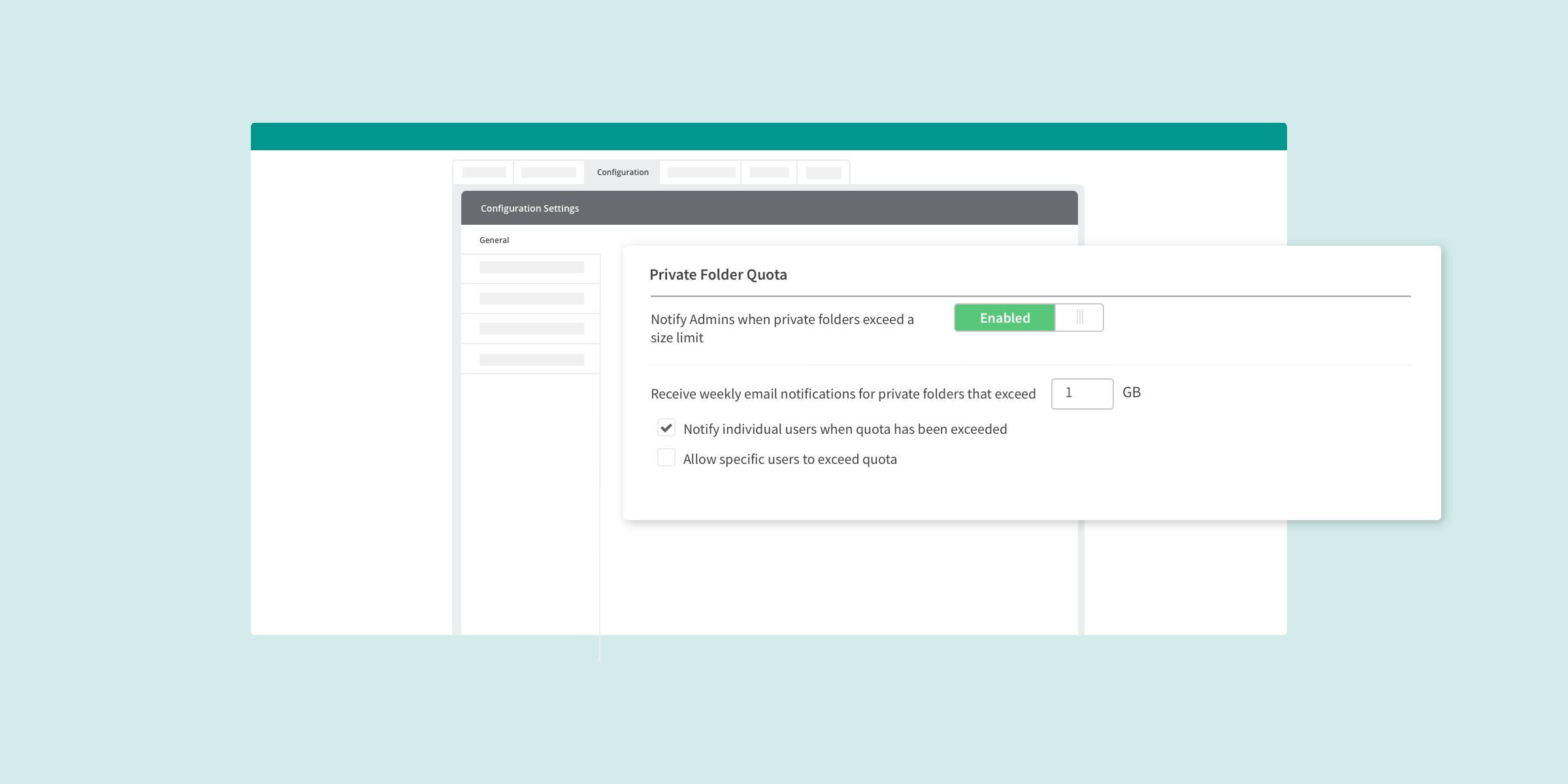 Administrators can set up target private folder sizes and get notified weekly about users who have exceeded the limit.  End users can optionally be notified as well.