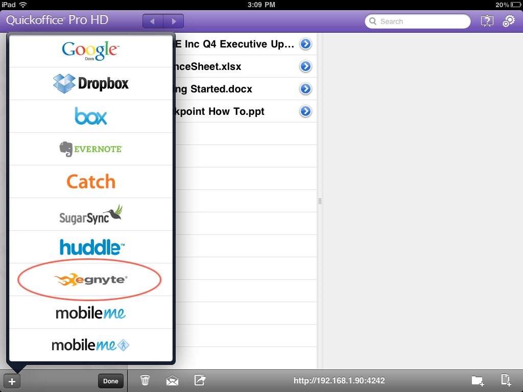 After requests from our users to add Quickoffice integration, we are pleased to announce that Egnyte for Quickoffice is now available on the iPad for all Power Users. The integration allows users to browse the entire Egnyte file system, view and edit MS Office files from the iPad.
