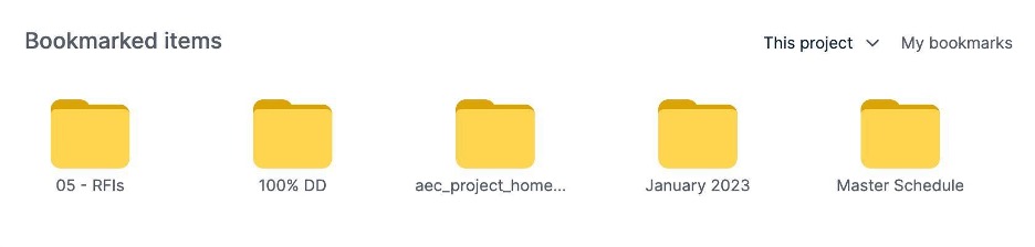 From the new project homepage, quickly access frequently used folders with bookmarks. By streamlining navigation for a more efficient workflow, no searching is required as your bookmarked folders appear automatically in the bookmarked items widget on your project homepage. Rest assured that each bookmark is tailored for you - take advantage of this personalized feature to make life a little easier.