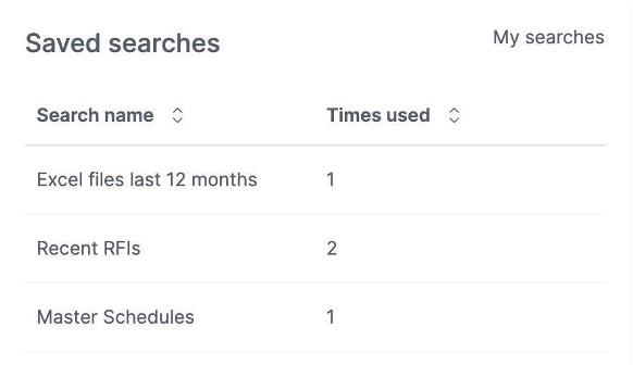 With this new feature, you can easily pinpoint relevant files within your projects. Find exactly what you need with the ability to sort saved searches by name or frequency of use. All your tailored search results can be available at a glance, right from the widget on your project homepage.
